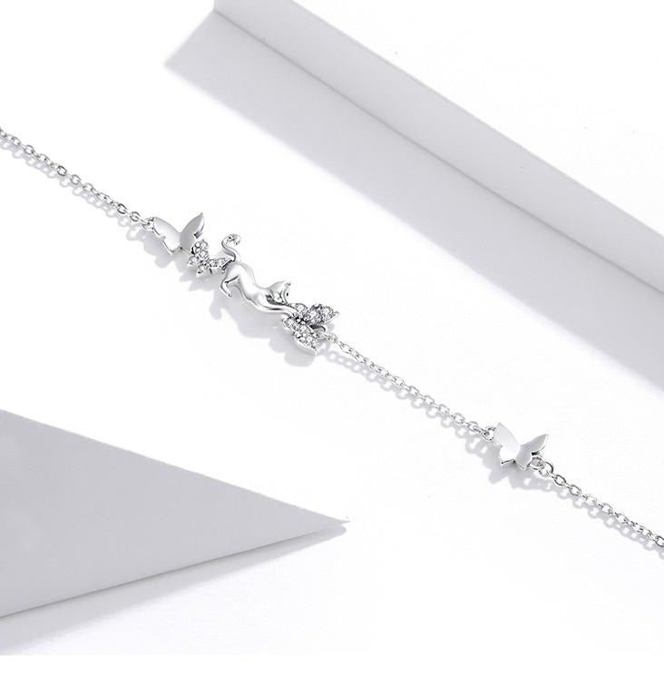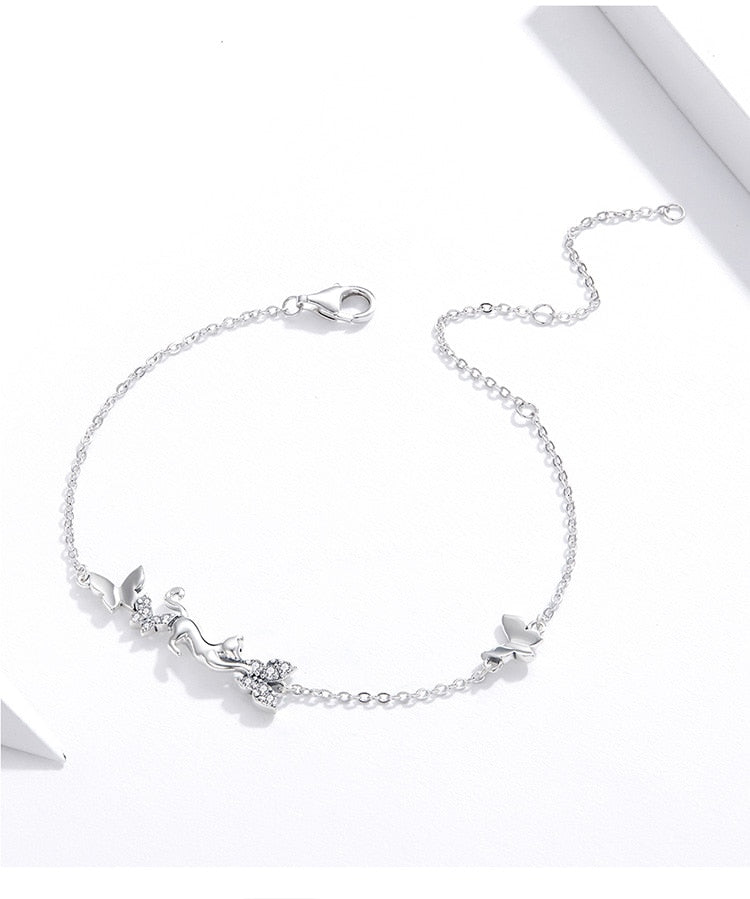 Wir präsentieren unser einzigartiges und wunderschönes Armband „Katze und Schmetterlinge“ aus Sterlingsilber. Mit einem wunderschönen Kätzchen aus 925er Silber, das flatternden Schmetterlingen nachjagt, verziert mit Zirkonia-Kristallen. Perfekt für jeden Katzenliebhaber!