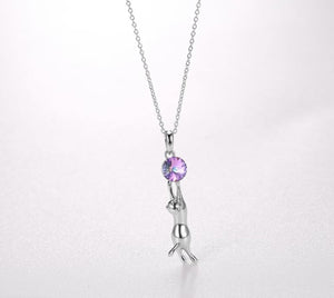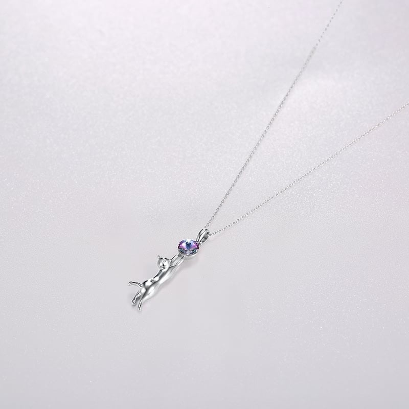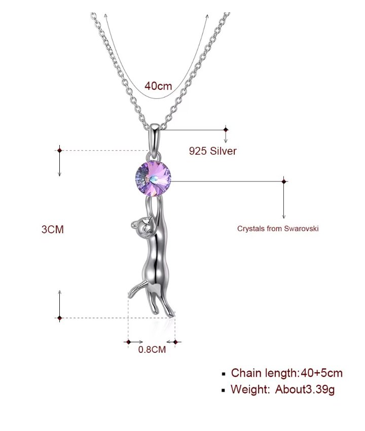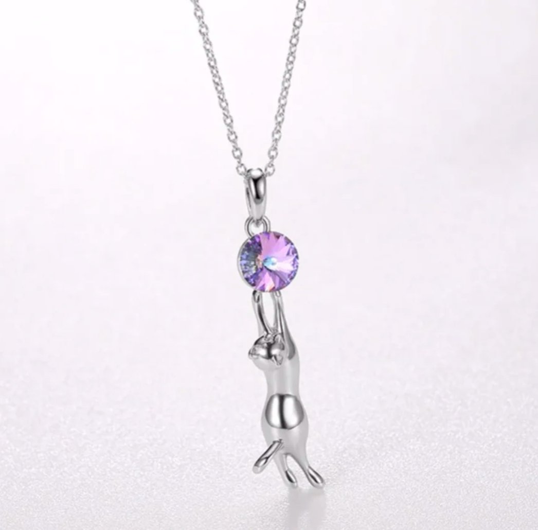 Presenting our unique and beautiful silver-plated climbing cat pendant, with a delicate 40 cm chain and sparkling Austrian blue/purple crystal ball.ย Purrrfect for every cat-lover!ย