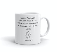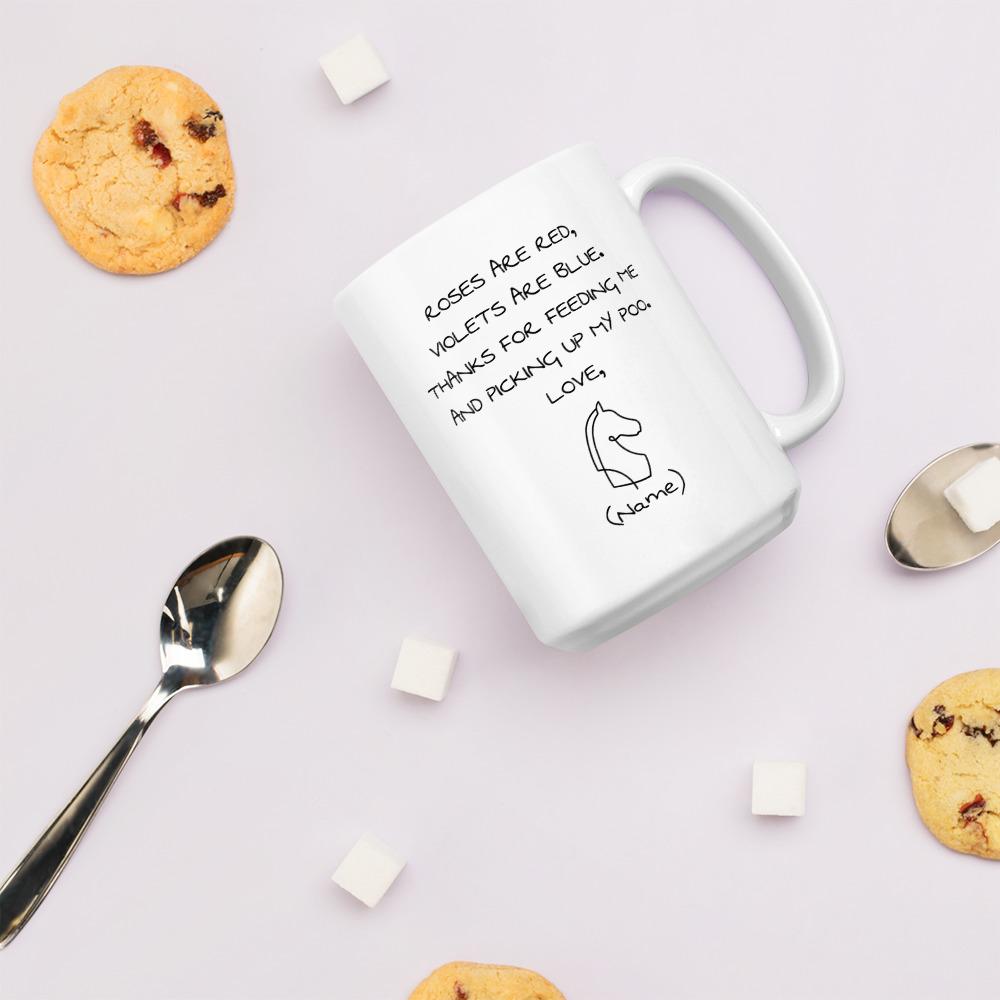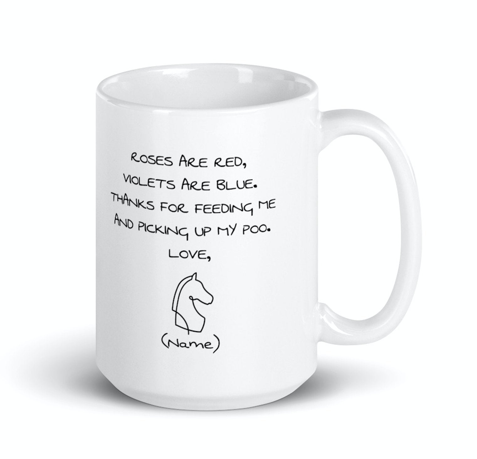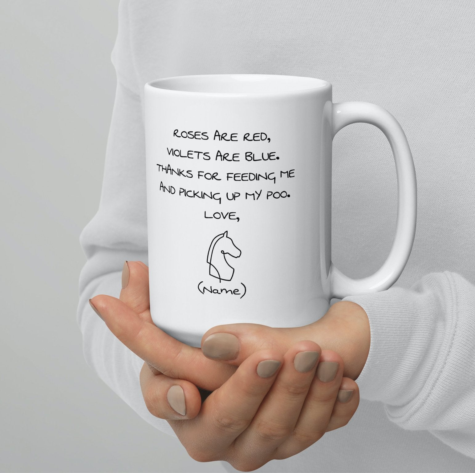 The perfect gift for any horse lover! The loving message on this gift mug from your equine friend reads, 'Roses are red, violets are blue. Thanks for feeding me, and picking up my poo'. I think we would all appreciate this sentiment!