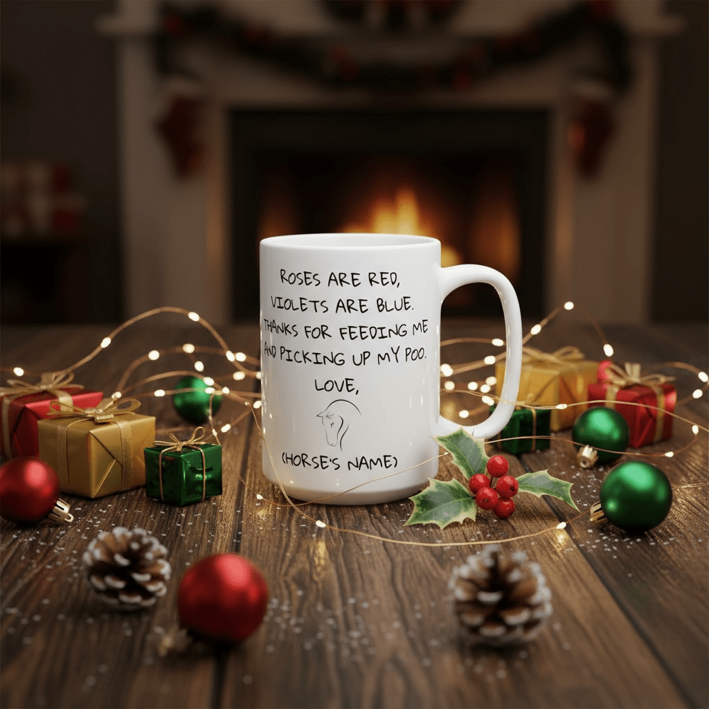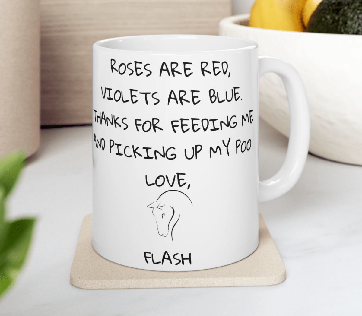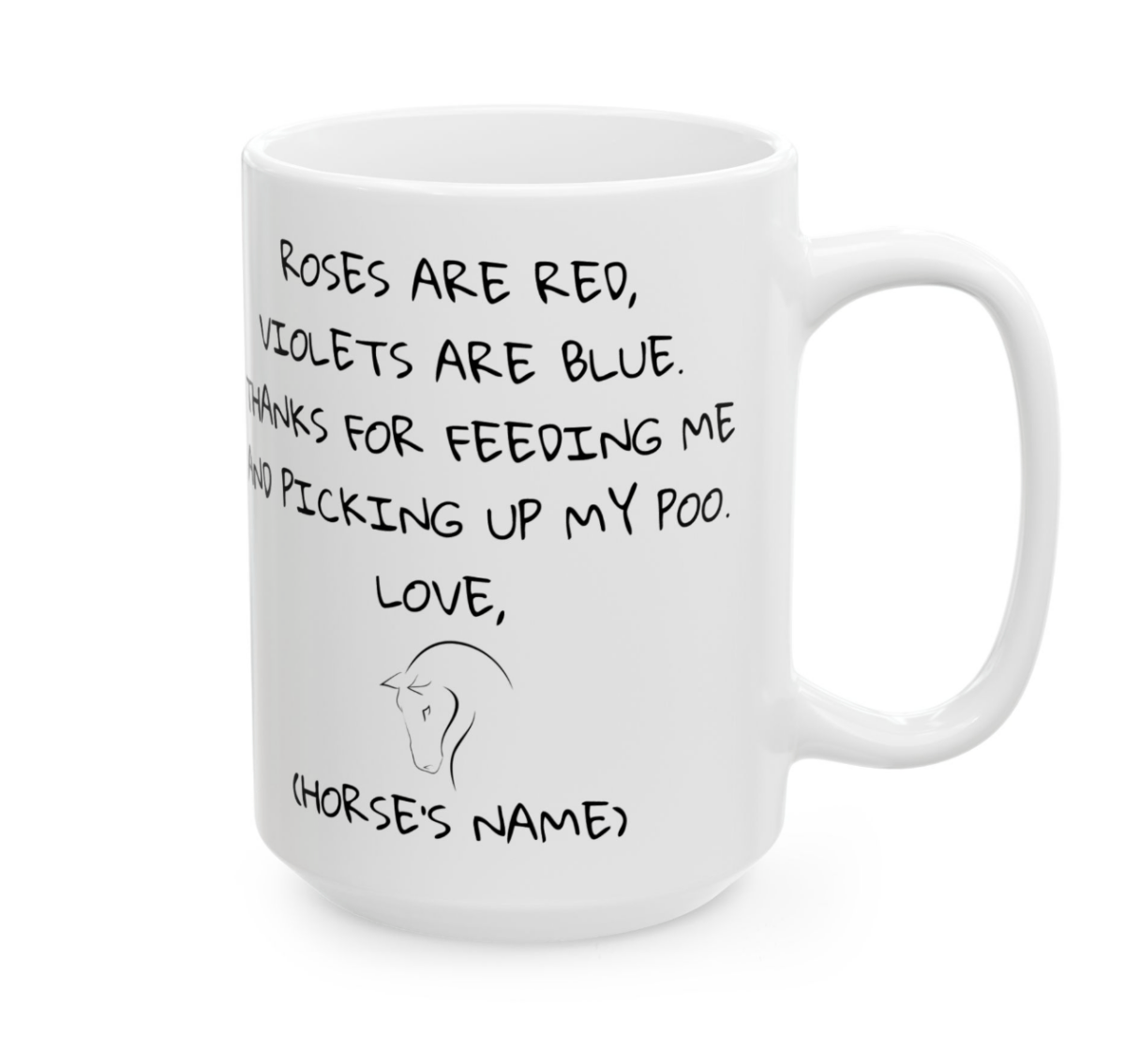 The perfect gift for any horse lover! The loving message on this gift mug from your equine friend reads, 'Roses are red, violets are blue. Thanks for feeding me, and picking up my poo'. I think we would all appreciate this sentiment!