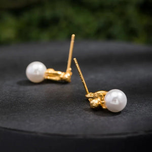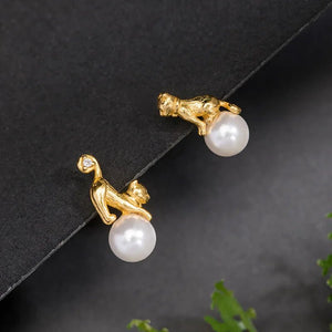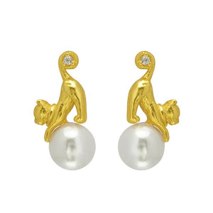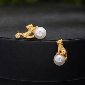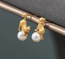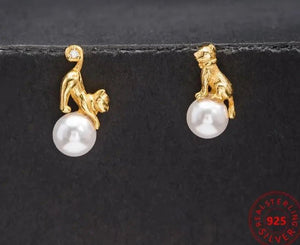 Introducing our gorgeous 18k gold plated Sterling silver kitty cat drop earrings, beautifully adorned with twinkly Rhinestone crystals,ย playing with a Shell Pearl ball.