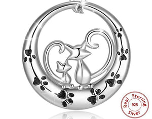 Introducing the latest in our adorable range of pendant necklaces for cat lovers: a stunning Rhodium plated Sterling silver hoop pendant, featuring a loving cat and kitten sitting side by side, surrounded by delicately inscribed paw prints.