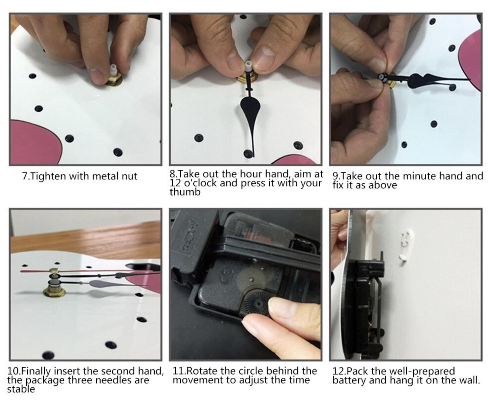 1. Align the hands to 12pm when assembling onto the clock mechanism thread, then adjust to the correct time via the dial on the back of the clock casing. Do not move the hands themselves.